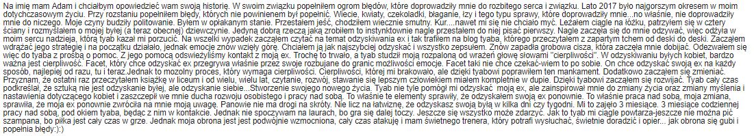 Jednak ja i tak zaryzykuję, bo wiem, że nawet jakbyś już to sobie w głowie planował, to po przeczytaniu pierwszego rozdziału zrobi Ci się po prostu głupio, gdyż te historie również mówią o Tobie! Nie będziesz miał sumienia mnie oszukać, nawet jak jesteś zawodowym kursowym oszustem, który zwrotami robi w chuja trenerów uwodzenia i rozwoju osobistego. Mnie nie oszukasz, bo docenisz mnie za jedną rzecz! SZCZEROŚĆ!