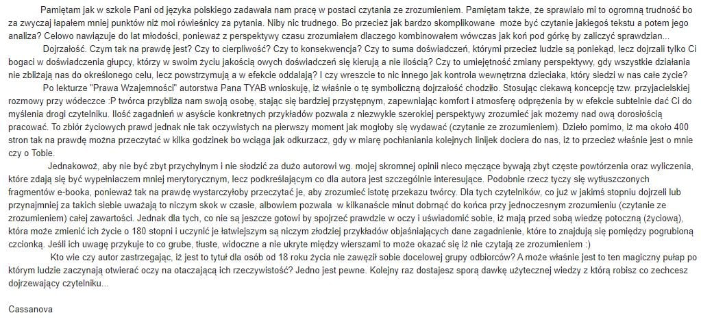 Jeśli któraś z tych 15 pierwszych osób po miesiącu – 30 dniach czasu od zakupu e-booka Prawo Wzajemności – Twoja Instrukcja Obsługi Ludzi, stwierdzi, że tematyka honoru, męskiej godności, przyjacielskich zasad, młodzieńczych błędów, pijackich wybryków, zawodu najbliższych, poznawania i zjednywania sobie ludzi i wiele, wiele innych zagadnień związanych z obcowaniem z ludźmi, jest nie dla niej, bo nie pasuje Ci mój luzacki styl pisma, albo wyłapałeś gdzieś jakąś literkę lub nie dałem Ci nic do myślenia, to napisz do mnie, żebym zwrócił Ci pieniądze, a ja bez pytania to zrobię. Myślę, że miesiąc czasu wystarczy Ci na przeczytanie tej książki nie raz, ani nie dwa, bo mimo iż to 400 stron, ale zajebiście szybko się czyta.